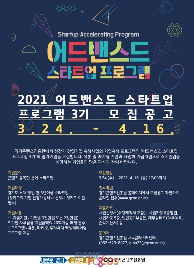 경기콘텐츠진흥원(이하 경콘진)은 오는 24일부터 4월 16일까지 성장기 콘텐츠 창업기업을 육성하는 ‘어드밴스드 스타트업 프로그램’ 참가자를 모집한다.