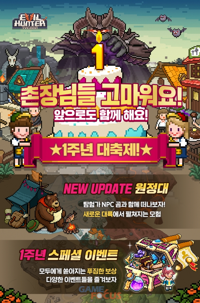 슈퍼플래닛이 자사에서 퍼블리싱하고 레트로아츠에서 개발한 모바일 경영 시뮬레이션 RPG '이블헌터타이쿤(글로벌 타이틀 명 Evil Hunter Tycoon)'의 글로벌 출시 1주년을 맞이해 대규모 업데이트를 실시한다.