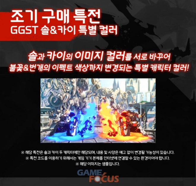 또 길티기어 -스트라이브- 한국어 패키지판을 예약 구매하거나 PlayStation Store에서 디지털 다운로드판을 예약 구매하면, 조기 구매 특전으로 플레이어블 캐릭터인 솔과 카이의 특수 컬러를 대전에서 사용할 수 있는 'GGST 솔&카이 특별 컬러'를 증정한다.