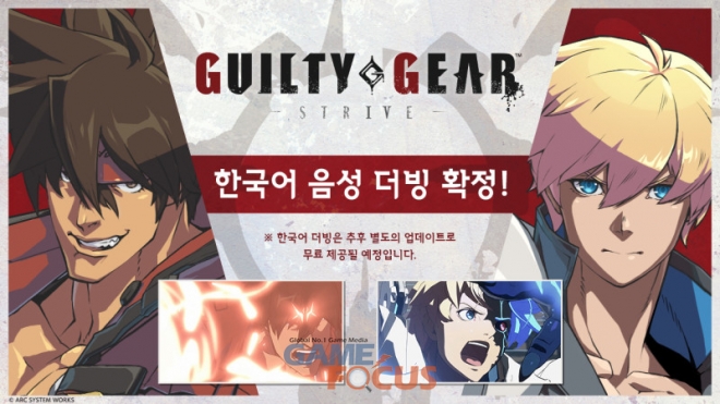 길티기어 -스트라이브-의 한국어 음성 더빙은 출시 이후 별도의 무료 업데이트로 제공될 예정이며, 시즌패스와 DLC로 추가되는 캐릭터 또한 지속적으로 한국어 음성 더빙이 이뤄질 예정이므로, 향후 전개되는 길티기어 -스트라이브-의 모든 콘텐츠를 한국어 음성과 함께 계속해서 즐길 수 있다. 한국어 음성 더빙에 참여할 성우진과 샘플 보이스의 공개, 업데이트 일정 등 자세한 사항은 추후 공개될 예정이다.
