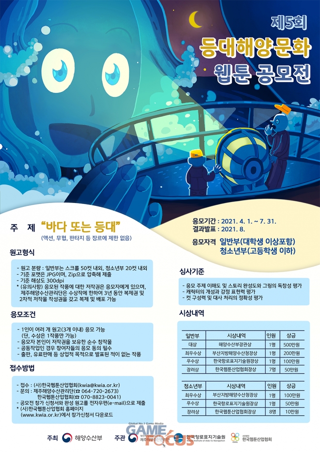 한국웹툰산업협회(회장 서범강)가 부산지방해양수산청 제주해양수산관리단(단장 홍상표), 한국항로표지기술원(원장 박계각)과 함께 제5회 등대해양문화 웹툰 공모전을 개최한다.