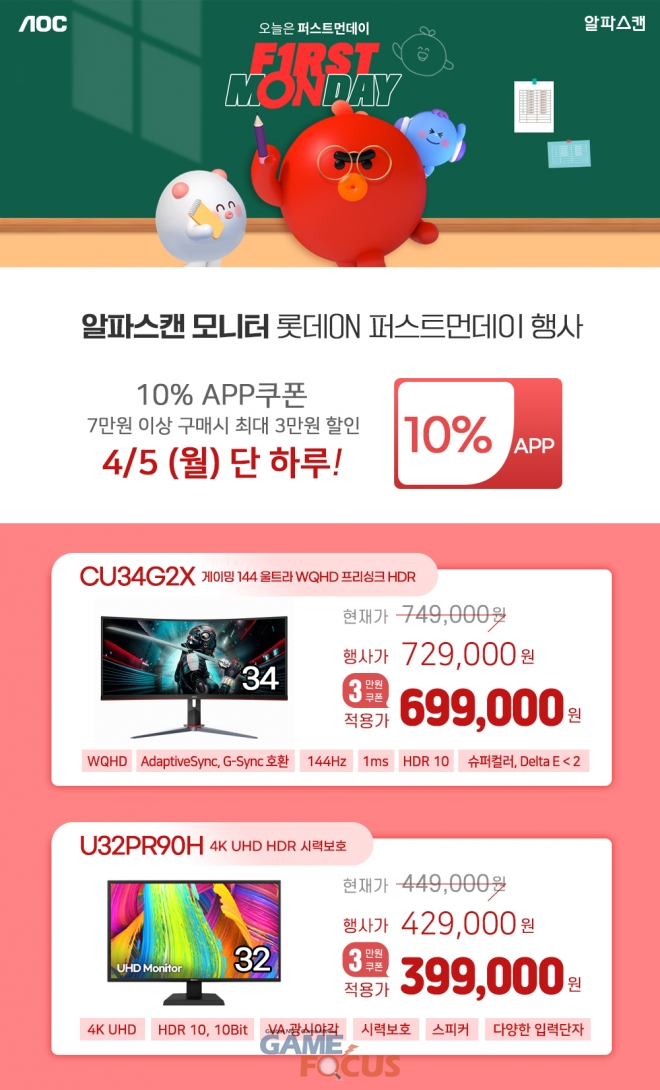 4월 5일 단 하루 롯데ON에서 진행되는 퍼스트 먼데이 행사에서 'CU34G2X'는 기본 할인과 10% 앱쿠폰을 적용하면 정상가 749,000원에서 5만원 할인된 699,000원에, 'U32PR90H'는 정상가 449,000원에서 5만원 할인된 399,000원에 구매할 수 있다.