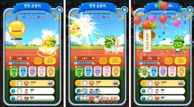 이번 업데이트에서는 콩이나 모래를 넣은 주머니를 던져 공중에 매달린 박을 터뜨리는 운동회의 단체 게임을 콘셉트로 기획, 첫 선을 보이는 팡팡 운동회가 눈에 띈다. 퍼즐 스테이지를 클리어하고 획득하는 주머니로 참가하는 '팡팡 운동회'는 50명 단위의 1개 그룹에서 믹키반, 블루반, 애니반 등 5개 반에 10명씩 배정된 이용자들이 점수 경쟁을 벌이는 경쟁형 이벤트다.