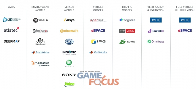 다른 파트너들은 자율주행차 시스템이 특정 핵심 성능 지표를 충족하는지 여부를 평가하는 특정 시나리오 카탈로그와 시나리오 기반 검증 및 검증 방법론을 제공한다. 이러한 기준은 규제 요건 또는 업계 표준일 수 있다. 엔비디아는 자율주행차 시뮬레이션을 위한 표준을 만드는 것을 목표로 전 세계 여러 프로젝트, 컨소시엄 및 표준 조직에 참여하고 있다.