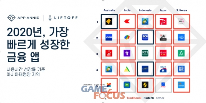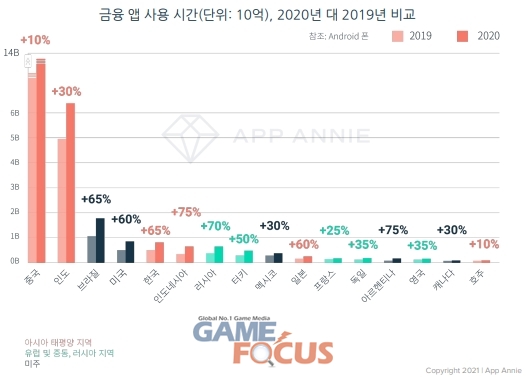 지난 한 해 전 세계적으로 46억 회의 신규 금융 앱이 다운로드 됐으며, 중국을 제외한 금융 앱 사용시간은 163억 시간을 기록했다. 전년 대비 다운로드는 15%, 사용 시간은 45% 증가했다. 한국의 다운로드는 전년보다 10% 증가했으며, 사용 시간은 글로벌 평균 보다 20% 많은 65%의 성장률을 보였다.