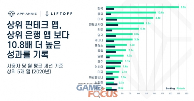 한국은 전 세계에서 핀테크 앱과 뱅킹 앱의 세션 수 격차가 가장 컸다. 한국의 상위 5개 핀테크 앱과 뱅킹 앱의 세션 수를 비교해본 결과, 핀테크 앱이 뱅킹 앱보다 월평균 8.9배 더 많이 접속하는 것으로 나타났다. 핀테크 앱의 유저당 월평균 세션 수는 225회로, 이는 사용자가 하루 평균 7회 이상 핀테크 앱에 접속하는 셈이다.