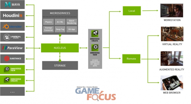 엔비디아 옴니버스는 사용자가 선호하는 콘텐츠 제작 및 시각화 애플리케이션에서 2D 및 3D 시뮬레이션 데이터를 USD(Universal Scene Description) 형식으로 공유할 수 있는 실시간 협업 플랫폼이다. 글로벌 팀들은 옴니버스를 사용해 실시간 연결로 동일한 데이터세트를 보고, 상호 작용하고, 업데이트할 수 있으므로, 진정으로 상호적인 협업이 가능하다.