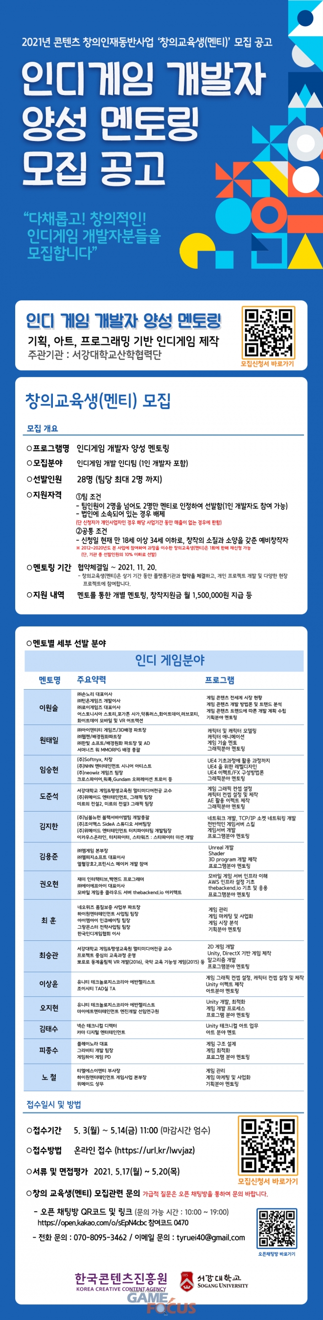 한국콘텐츠진흥원과 서강대학교 산학협력단이 게임 콘텐츠 제작자 육성을 위한 '2021년도 콘텐츠 창의인재 동반사업'을 진행하며, 오는 5월 14일까지 창의 교육생(멘티)을 모집한다.