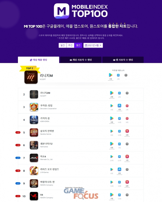 4월 통합 랭킹에서도 엔씨소프트의 '리니지M'과 '리니지2M'이 순위 변동 없이 나란히 1, 2위를 차지했으며, 데브시스터즈의 '쿠키런: 킹덤'도 여전한 인기를 보여주며 지난달에 이어 3위 자리를 지켰다. 3월 통합 랭킹에서 492계단 상승하며 빠르게 상위권에 진입한 쿠카 게임즈의 '삼국지 전략판'은 이달 구글플레이 9위, 원스토어 랭킹 3위에 힘입어 통합 랭킹 5위를 기록했다.