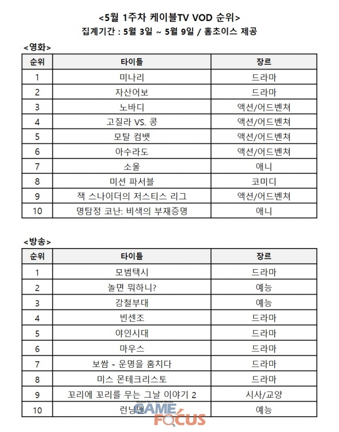 (주)홈초이스가 발표한 LG헬로비전, Btv 케이블, 딜라이브, CMB, 현대HCN 등 전국 케이블TV '5월 1주차 영화 · 방송 VOD 순위'에 따르면, 배우 윤여정이 아카데미 여우조연상을 수상한 '미나리'가 3주 연속 1위를 차지했다.