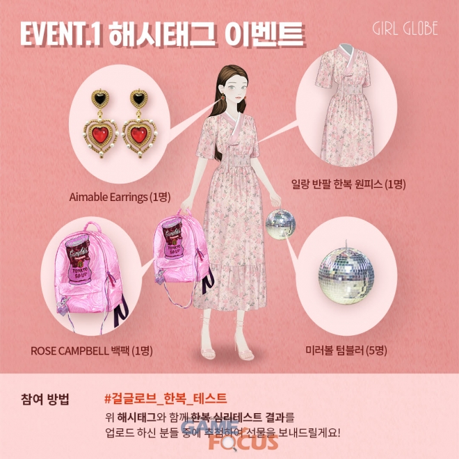 여성향 게임 개발사 '에어캡(대표 현지민)'이 자사에서 개발하고 서비스 중인 모바일 드레스업 게임 '걸 글로브(GIRL GLOBE)'에서 MZ세대에 좋은 반응을 얻고 있는 취향 분석 테스트 사이트 'K-TEST'와 함께 '걸 글로브 한복 해시태그, 리트윗 이벤트'를 5월 14일부터 오는 6월 14일까지 실시한다.