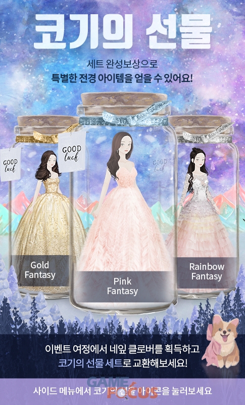 한편, 에어캡은 한복 테스트와 함께 오는 5월 27일까지 유저 활성화를 위한 '코기의 선물' 이벤트를 실시한다. 이벤트 과정에서 획득하는 클로버로는 '골드 판타지', '핑크 판타지', '레인보우 판타지'로 명명된 세 종류의 '셋업 한정 의상'으로 교환이 가능하다.