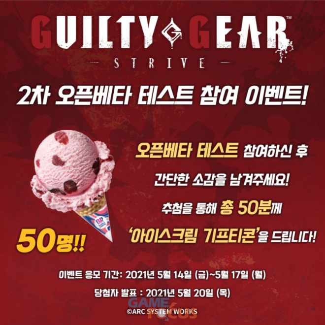 아크시스템웍스 아시아지점은 '길티기어 -스트라이브-'의 2차 오픈베타 테스트에 참여하고, 간단한 소감을 자유롭게 남기어 인증하면, 추첨을 통해 총 50명에게 '아이스크림 기프티콘'을 증정하는 이벤트를 개최한다고 밝혔다. 구체적인 일정 및 이벤트에 대한 자세한 내용은 다음과 같다.