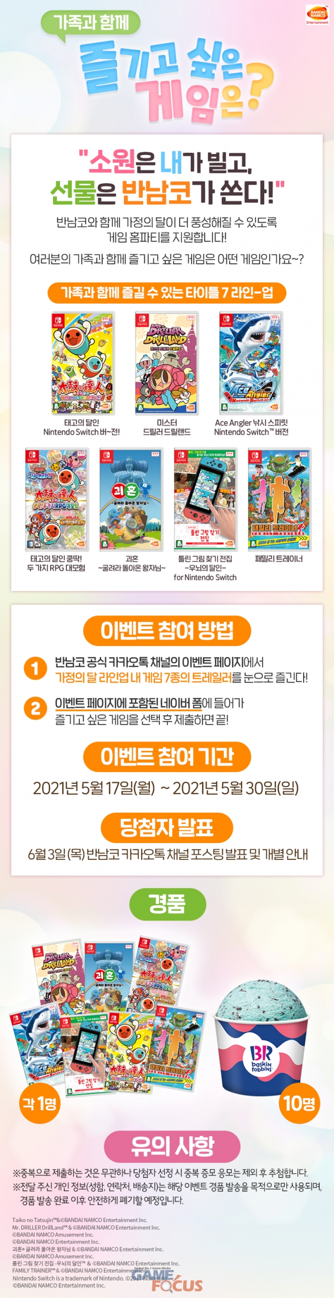 반다이남코 엔터테인먼트 코리아의 공식 카카오톡 채널에서는 5월 가정의 달을 기념해 오늘부터 오는 5월 30일 (일)까지 ‘게임 홈파티 지원 이벤트’를 진행한다. 반다이남코 엔터테인먼트 코리아에서 발매한 Nintendo Switch용 인기 게임 타이틀 7종 가운데 플레이하고 싶은 타이틀을 고르고, 선택한 이유 등을 이벤트 참여 폼에 남기면, 추첨을 통해 자신이 선택한 게임 타이틀(소프트 당 1명, 총 7명), 배스킨라빈스 패밀리 아이스크림 교환권(10명)을 증정한다.