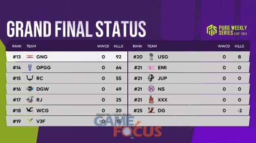 지난 5주간의 위클리 파이널 승리 팀 및 치킨 횟수 상위 팀까지 총 16개 팀은 오는 5월 21일(금)~23일(일)까지 PWS 페이즈 1 그랜드 파이널에 출전한다. 매일 6매치씩 총 18매치를 치르고, 치킨 획득 수 및 킬 수로 순위가 결정된다. 최다 치킨 획득 팀이 PWS 페이즈 1 최종 우승과 상금 4천만 원의 주인공이 된다. 또한, 상위 8개 팀은 6월에 개최될 글로벌 대회 ‘펍지 콘티넨털 시리즈(PCS) 4 아시아’에 출전할 기회도 얻는다.