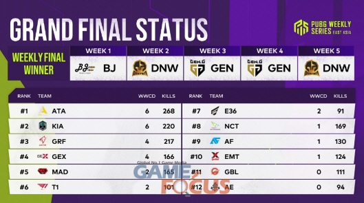 ㈜크래프톤(대표 김창한)의 펍지 스튜디오가 플레이어언노운스 배틀그라운드(PUBG, 이하 배틀그라운드) 동아시아 지역 통합 이스포츠 대회인 ‘펍지 위클리 시리즈(PUBG WEEKLY SERIES: EAST ASIA, 이하 PWS)’ 페이즈 1의 5주 차 위클리 파이널 결과를 공개했다.