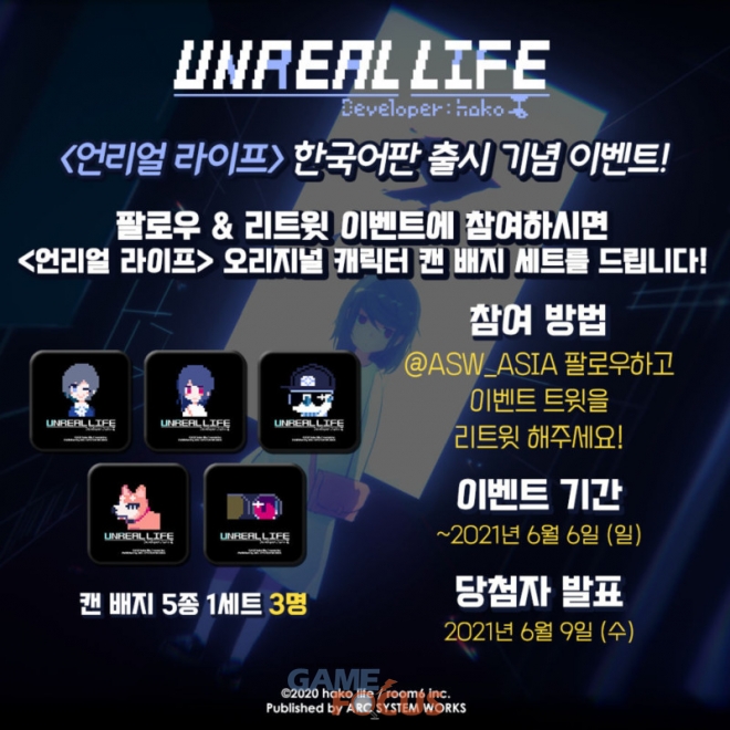 아크시스템웍스 아시아지점은 닌텐도 스위치 '언리얼 라이프' 한국어판의 출시를 기념하여, 게임 내 등장하는 캐릭터들의 도트 이미지를 테마로 한 '언리얼 라이프 오리지널 캐릭터 캔 배지'를 추첨을 통해 증정하는 이벤트를 오늘부터 개최한다. 참여 방법 등 이벤트에 대한 자세한 내용은 다음과 같다.