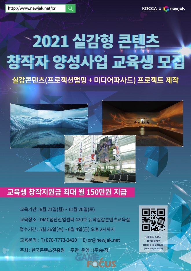 교육은 6월 20일부터 11월 19일로 5개월간 이뤄지며, 뉴작실감콘텐츠교육실(서울시 마포구 성암로 330 첨단산업센터 420호)에서 진행된다.