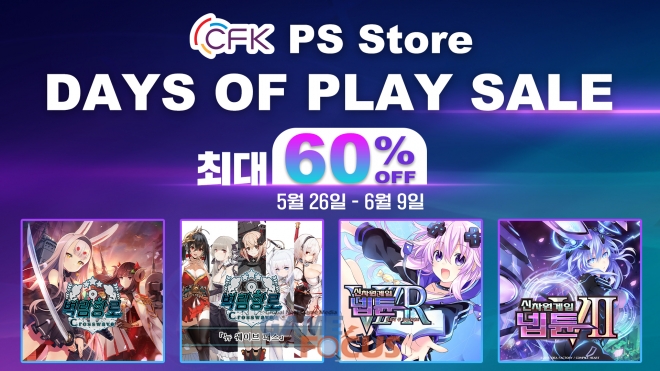 게임 퍼블리셔 CFK가 5월 26일(수)부터 6월 9일(수)까지 기간 한정으로 'Days of Play' 세일을 진행한다. 이번 세일은 PlayStation Store에서 판매 중인 PlayStation4 타이틀 위주로 진행되며, 스토어에서 CFK 다운로드 전용 소프트를 저렴하게 할인된 가격으로 만나볼 수 있다.
