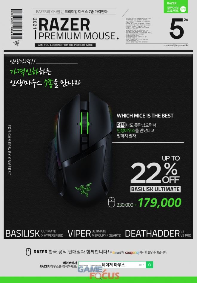 레이저(RAZER)가 자사의 프리미엄 게이밍 마우스 제품들에 대한 착한 가격 프로젝트 행사를 실시한다.