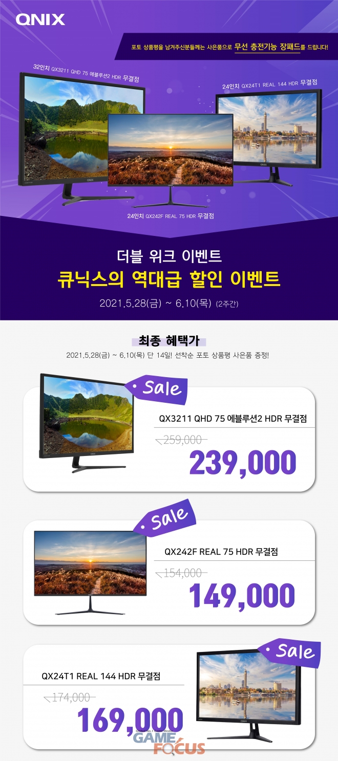 더블 위크에 참여하는 모니터 모델은 32형 QX3211 QHD 75 에블루션2 HDR 무결점, 24형 QX242F Real 75 HDR 무결점과 QX24T1 Real 144 HDR 무결점으로 총 3모델이다.
