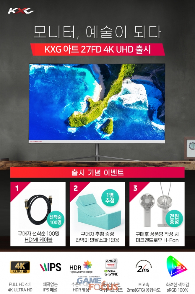 'KXG 아트 27FD 4K UHD'의 출시를 기념해 다양한 이벤트를 진행한다. 먼저 구매자 전원에게는 HDMI 2.0 케이블을 증정한다. 구매 후 포토, 동영상 상품평 작성자에게는 휴대용 무선 선풍기를 증정하며 구매자 추첨을 통해 1인용 반달소파를 제공한다.