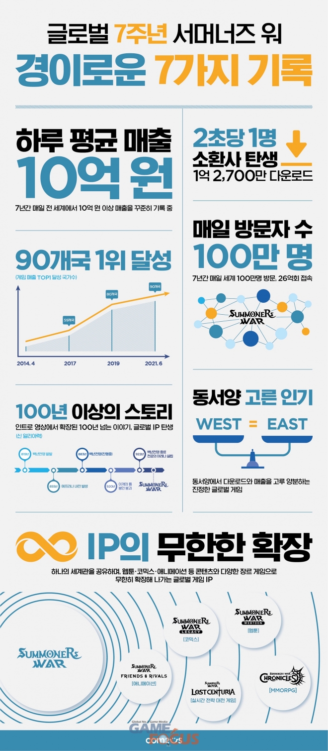 컴투스(대표 송재준)는 자사의 글로벌 히트작 ‘서머너즈 워: 천공의 아레나(이하 서머너즈 워)’의 글로벌 서비스 7주년을 기념해 ‘서머너즈 워’가 지금까지 쓴 경이로운 기록 7가지를 인포그래픽에 담아 14일 공개했다.