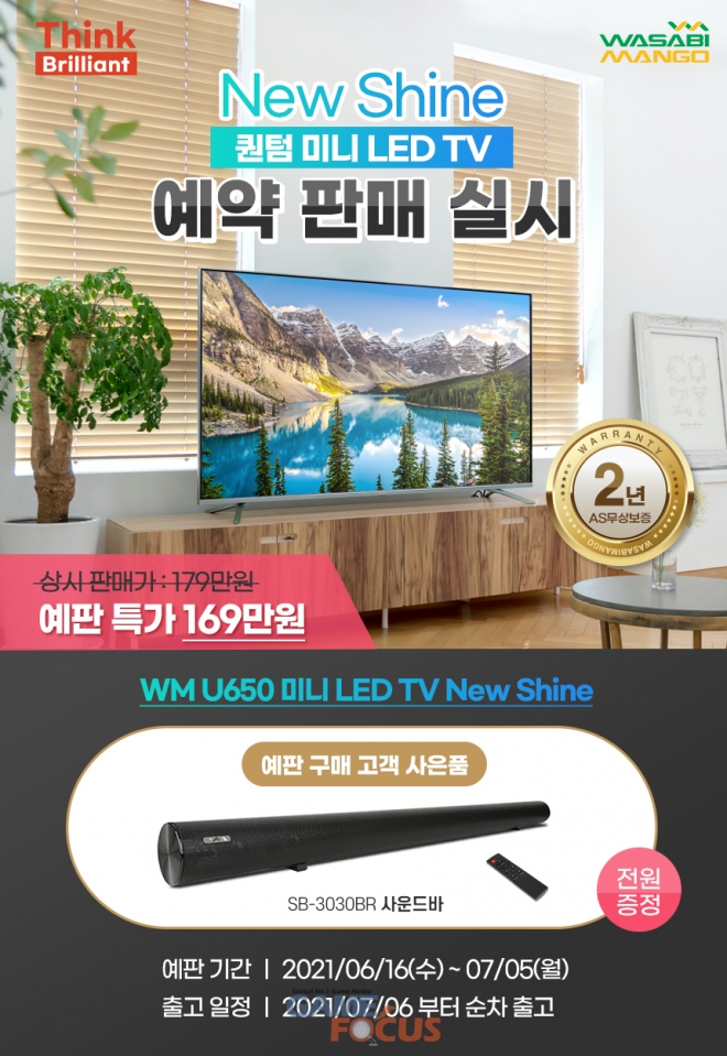 와사비망고(대표 김환준)가 9,216개의 미니 LED와 576개의 로컬 디밍 존을 갖춘 퀀텀 미니 LED TV 'New Shine'의 예약판매를 시작한다.