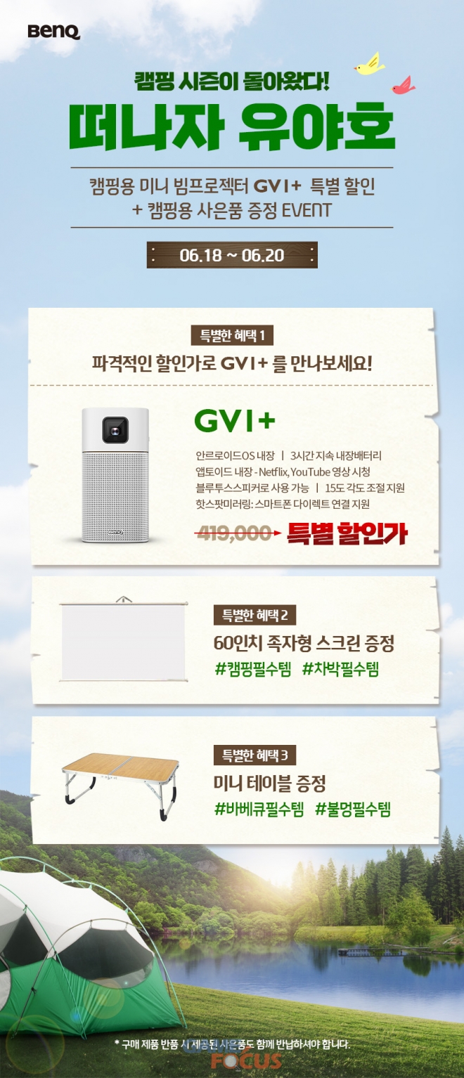 벤큐(지사장 소윤석)가 캠핑 시즌을 맞이하여 미니 빔프로젝터 GV1+ 구매자를 대상으로 파격적인 가격 할인과 특별 사은품을 증정하는 긴급 공수 프로모션을 진행한다.