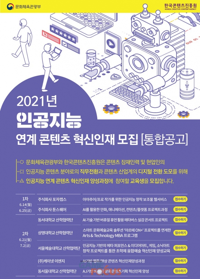 문화체육관광부(장관 황희)와 한국콘텐츠진흥원(원장직무대행 정경미, 이하 콘진원)은 미래 콘텐츠산업 혁신을 이끌 ‘2021년 인공지능 연계 콘텐츠 창의인재 양성사업’에 참여할 교육생을 모집한다.
