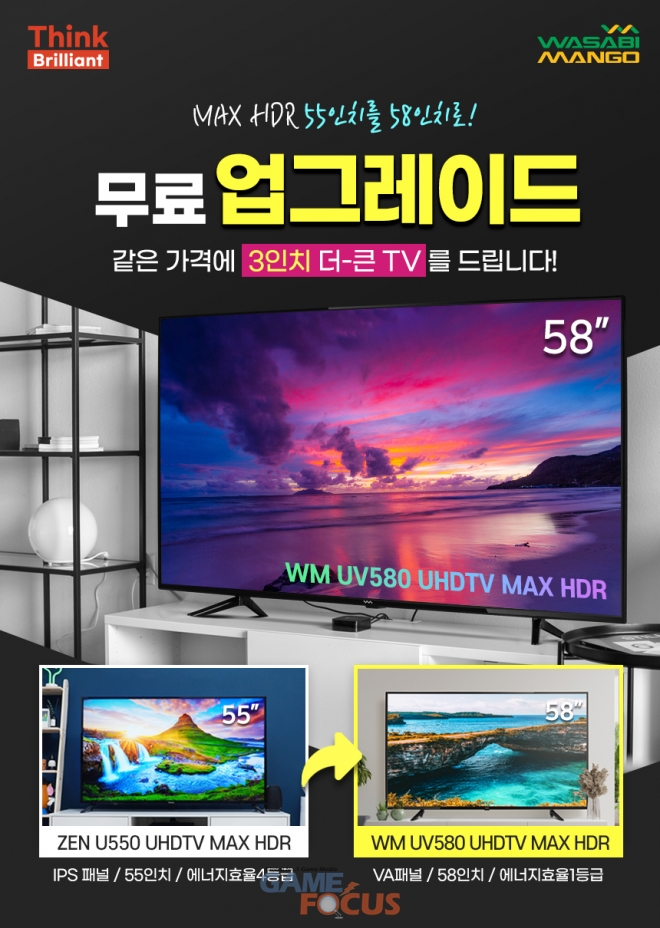 와사비망고(대표 김환준)가 자사 55인치 UHD TV인 'ZEN U550 UHD TV MAX HDR' 제품 구입 시 3인치 더 크고, 에너지 소비효율 1등급 제품인 58인치 UHD 4K TV 'WM UV580 UHDTV MAX HDR' 업그레이드 행사를 진행한다.