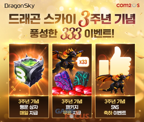 또한 공식 SNS에서도 3주년을 축하하는 커뮤니티 이벤트가 진행된다. 유저들은 '드래곤스카이' 페이스북을 방문해 축하 메시지를 남기고, 특별한 선물을 보상으로 받아볼 수 있다.