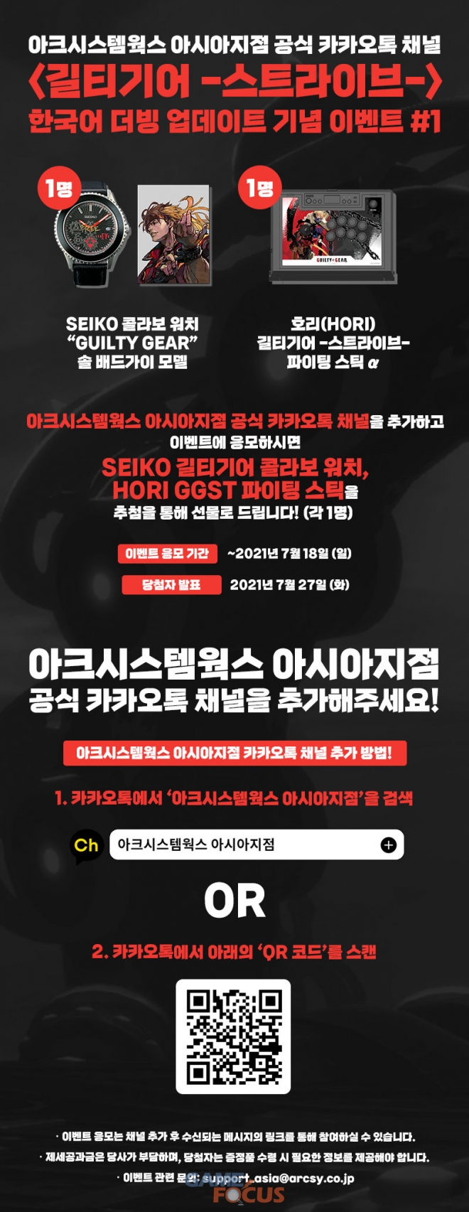 '길티기어 -스트라이브-'의 한국어 더빙 업데이트를 기념하여 준비된 이벤트, 그 첫 번째는 아시아지점 공식 카카오톡 채널 친구 추가 이벤트로, 아크시스템웍스 아시아지점의 공식 카카오톡 채널을 추가한 후, 공식 블로그를 통해 채널 추가 인증 이벤트에 참여하면 추첨을 통해 ‘SEIKO 길티기어 콜라보 워치’와 ‘HORI GGST 파이팅 스틱’을 증정한다. 오늘부터 진행되는 해당 이벤트에 대한 내용은 다음과 같다.