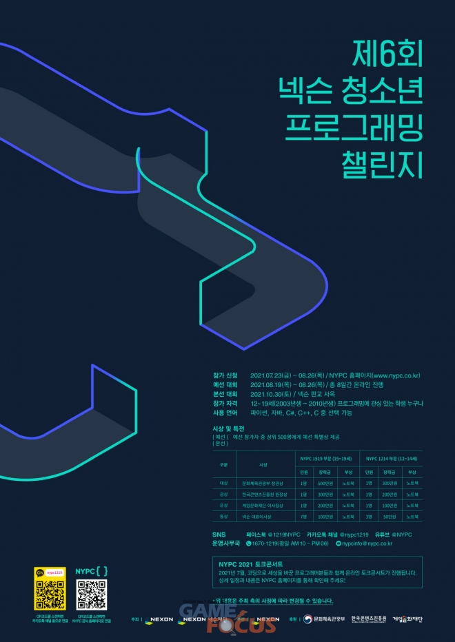 한편, 넥슨은 대회에 앞서 NYPC의 대표적인 멘토링 프로그램 ‘NYPC 토크콘서트’를 7월 중 라이브 스트리밍 방식으로 진행한다. ‘NYPC 토크콘서트’의 세부 일정 및 시청 방법은 추후 NYPC 홈페이지를 통해 별도 공지할 예정이다.