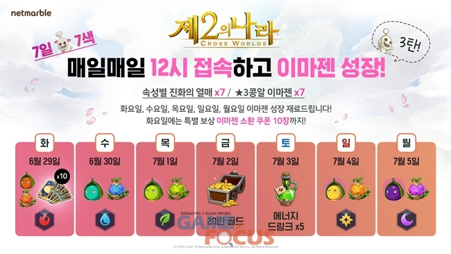 먼저 넷마블은 '7일 7색 접속 보상 이벤트' 3탄을 내달 5일까지 실시한다. 이벤트 기간 중 게임에 접속하면 '이마젠 소환 쿠폰 10장'을 포함해, 이마젠 성장에 도움이 되는 '속성별 3성 콩알', '진화의 열매' 등을 증정한다.
