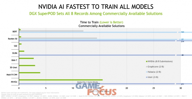 이번 벤치마크 테스트에서 8개의 워크로드를 모두 실행한 기업은 엔비디아 및 엔비디아의 파트너사 뿐이었으며, 제출한 작업물은 전체 제출물의 4분의 3이상을 차지했다. 또한, 작년에 보여준 테스트 점수와 대비해 최대 3.5배 이상 더 뛰어난 성능을 보였다. 엔비디아는 가장 많은 성능이 필요한 대규모 작업을 위해, 테스트 제출물 중에서 가장 많은 4,096개의 GPU을 사용해 리소스를 모았다.
