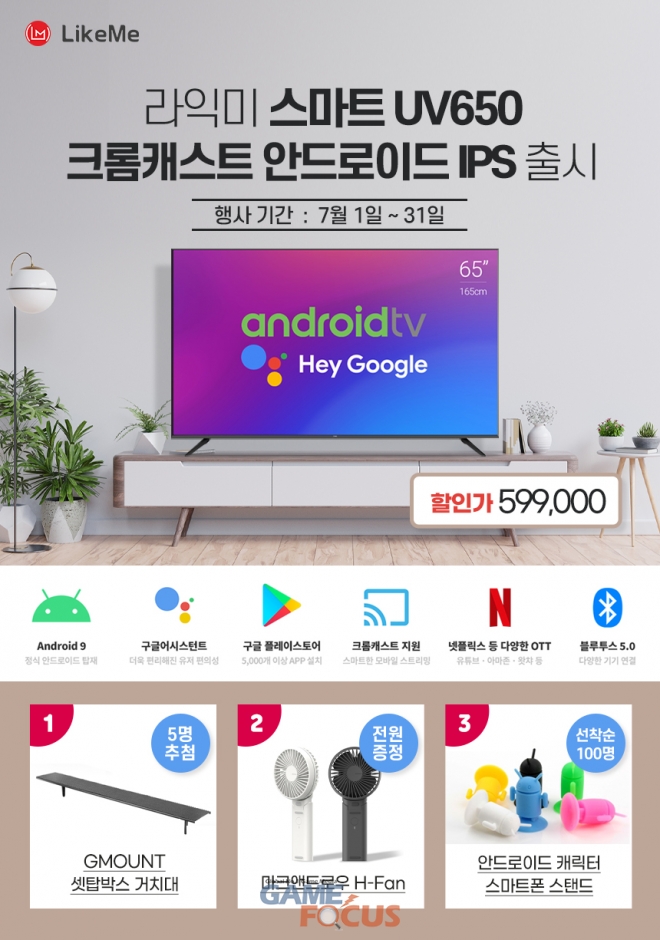 '스마트 UV650 크롬캐스트 안드로이드 IPS'는 출시를 기념해 다양한 사은품 증정행사를 진행한다. 구매 고객 전원에게 휴대용 선풍기를 증정하며 선착순 100명에게는 안드로이드 캐릭터 스마트폰 스탠드를, 추첨을 통해 셋탑박스 거치대90을 5대 증정한다.