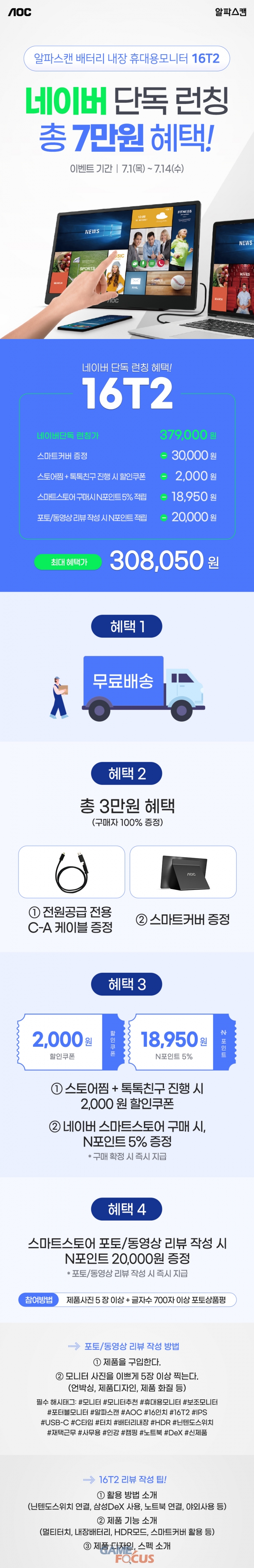 7월 1일부터 14일까지 네이버 단독으로 진행되는 16T2 런칭 행사에서는 무료배송은 물론 전원공급용 USB C-A 케이블과 스마트커버 포함 3만원 상당의 혜택을 구매자 전원에게 제공한다. 스토어찜과 톡톡친구 진행시 2천원 할인쿠폰을 제공하고, 스마트스토어 구매시 N포인트 5%를 증정한다. 또한, 스마트스토어에 포토나 동영상 리뷰 작성시 N포인트 2만원을 증정해 모든 행사 참여시 총 7만원의 혜택을 받을 수 있다.
