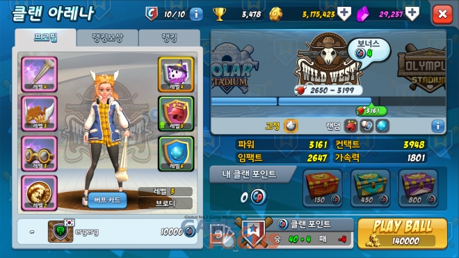 먼저 1vs1 모드에서 진행됐던 기존 클랜배틀 시스템을 개선한 신규 콘텐츠 '클랜 아레나'가 추가됐다. 별도 모드로 개최되는 '클랜 아레나'는 클랜 가입 유저에 한해 매시간마다 10회씩 참가 가능하며, 자신이 선택한 타자와 장비의 전체 파워 수치에 따라 경기장이 변경되는 방식이다. 각 경기장마다 지정된 장비를 장착하면 승리 시 보너스 CP가 주어지며, 최종적으로 오픈한 경기장과 그 아래 단계 경기장에서도 보너스 CP를 추가로 얻을 수 있다.