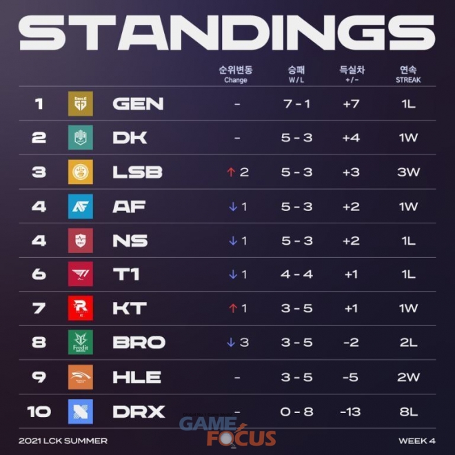 담원 기아가 젠지를 꺾으면서 전승 팀이 사라진 LCK는 중위권 혼전 양상이 가중됐다. 10개 팀 가운데 6개 팀이 4주차에서 1승1패를 기록했고 스플릿 초반에 부진했던 리브 샌드박스와 하위권에 처져 있던 한화생명e스포츠가 각각 2연승을 가져가면서 상위권과 중위권 싸움에 명함을 내밀었다.