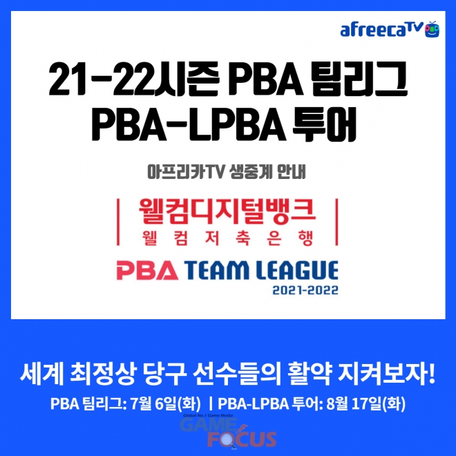 아프리카TV는 6일(화) 개막하는 ‘2021-2022 프로당구 PBA(Professional Billiards Association·프로당구협회) 팀리그(이하 PBA 팀리그)’를 시작으로 남자부 ‘PBA 투어’ 및 여자부 ‘LPBA 투어’ 전 경기를 생중계한다고 밝혔다. PBA는 대한민국의 PBA프로당구협회 주관의 3쿠션 투어 경기다.