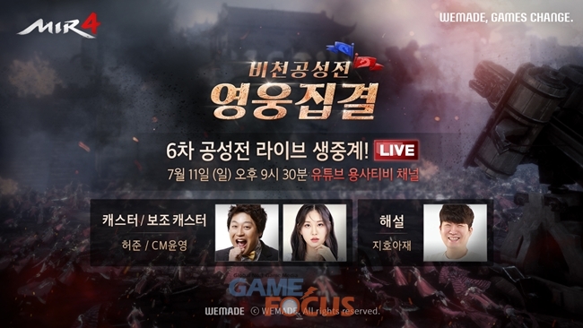 제6차 비천공성전은 11일 오후 9시 30분부터 '미르4' 공식 유튜브 채널 '용사티비'에서 중계될 예정이다. 위메이드는 이번 중계에 기존 유저뿐만 아니라 게임을 처음 접하는 시청자도 이해하기 쉽도록 캐스터와 해설을 투입한다. 제6차 비천공성전 해설은 게임 전문 캐스터 허준과 인기 게임 BJ 지호아재가 맡았다.