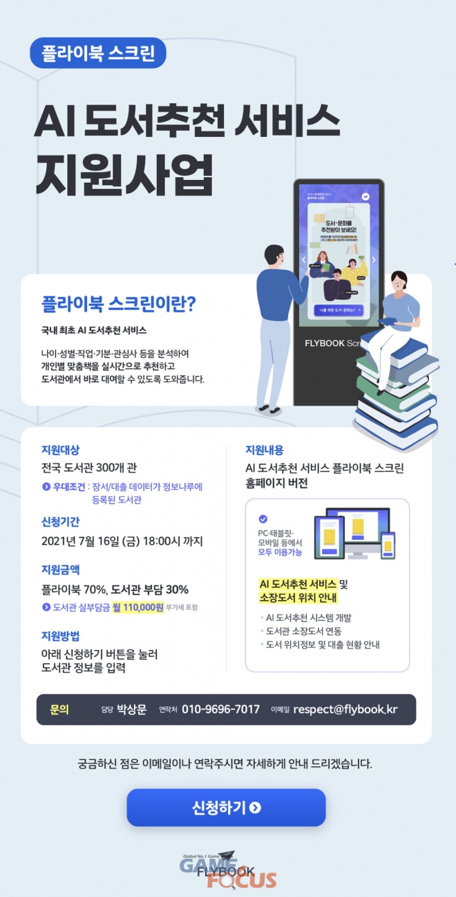 해당 사업은 도서관 이용 활성화를 위해 '플라이북 스크린' 홈페이지 제품의 서비스 이용료 70%를 지원하며 최대 264만원을 지원받을 수 있다. 최근 도서관 이용자들을 위한 도서 추천 필요성이 확산되면서 AI도서추천 서비스에 대한 수요가 크게 증가했다.
