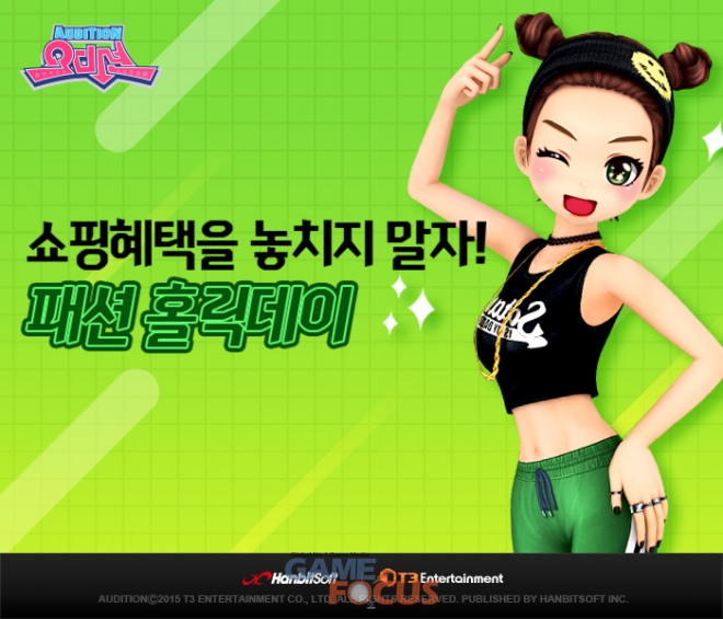 오디션은 또한 7월8일 점검 후부터 7월14일 23시59분까지 '패션홀릭데이' 이벤트를 통해 한정판 '빛나는 아이돌 무대 스타일' 아바타(패션 아이템)을 지급한다.
