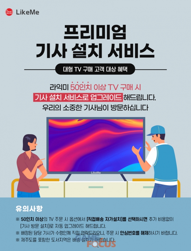 7월 15일부터 진행하는 프리미엄 기사 설치 서비스는 라익미의 50형 이상 TV 주문 시 직접 배송 자가설치를 선택하면 별도의 추가 비용 없이 기사 방문 설치로 업그레이드해드리는 서비스이다.