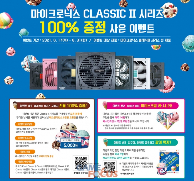 한편, 마이크로닉스는 클래식 II 풀체인지를 포함한 클래식 II 시리즈 전체를 대상으로 배스킨라빈스 상품교환권 5,000원권을 제공하는 이벤트를 진행 중이다. 클래식 II 풀체인지 시리즈 파워서플라이를 구입하고 영수증과 상품 전달에 필요한 간단한 정보를 마이크로닉스 이벤트 등록 페이지에 입력하면 응모가 끝난다. 이벤트는 8월 31일까지 진행된다.