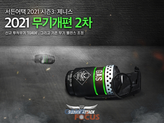 먼저, 신규 투척무기 'TG404'를 새롭게 선보였다. 'TG404'는 독가스 연막을 뿜어 상대에게 10초간 지속적인 대미지를 입히고 적의 시야와 진입을 방해하는 새로운 유형의 무기다.