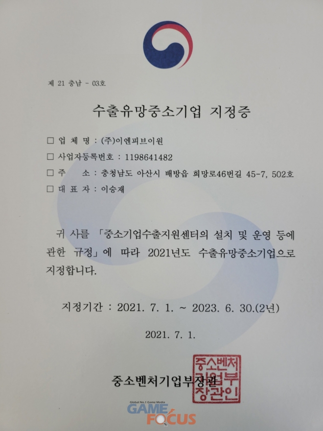 이엔피브이원 이승재 대표는 “글로벌을 선도하는 캐주얼게임을 만들기 위한 목표로 이엔피브이원은 다방면에서 사업을 진행하고 있다”라며, “이번 수출유망중소기업 지정을 기반으로 공격적인 해외 시장 공략에 나설 예정이다”고 전했다.
