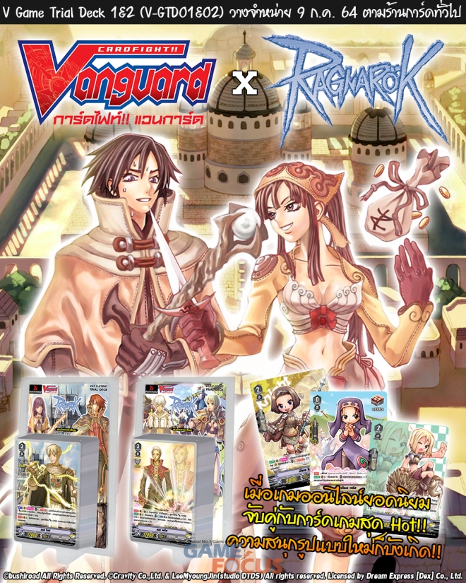 특히 나이트&마법사 덱을 대표하는 카드는 V-GTD01카드로 뒷줄에 있는 적의 카드를 앞으로 당기면 가속이 증가하는 효과를 가지고 있다. 또한 프리스트&헌터 덱을 대표하는 V-GTD02카드는 치유 기술과 함께 전투 지역을 확장시키는 효과가 있어 이를 활용해 다양한 전술을 구사할 수 있다. 라그나로크 뱅가드 배틀 카드 게임 스타터 팩의 소비자 가격은 한화로 약 4,200원(119바트)이다.
