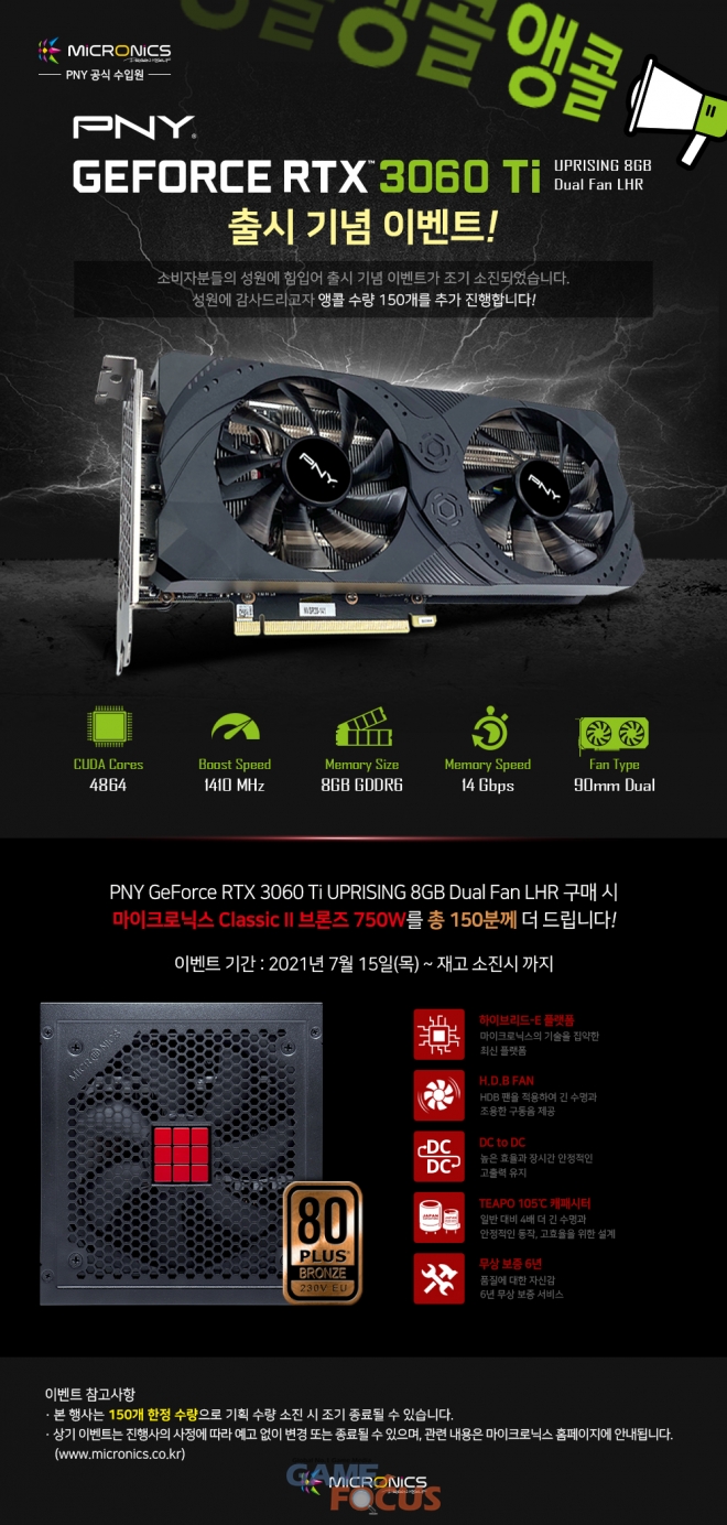 PNY 지포스 RTX 3060 Ti 출시를 기념하면서 이와 함께 사용할 수 있는 고성능 파워서플라이를 통해 최적의 경험을 제공하고자 기획된 이벤트는 소비자의 주목을 받으며 당초 준비한 제품 100개 모두 판매되었다. 이에 마이크로닉스는 더 많은 소비자가 최적의 경험을 할 수 있도록 앵콜 이벤트를 진행하기로 결정했다.